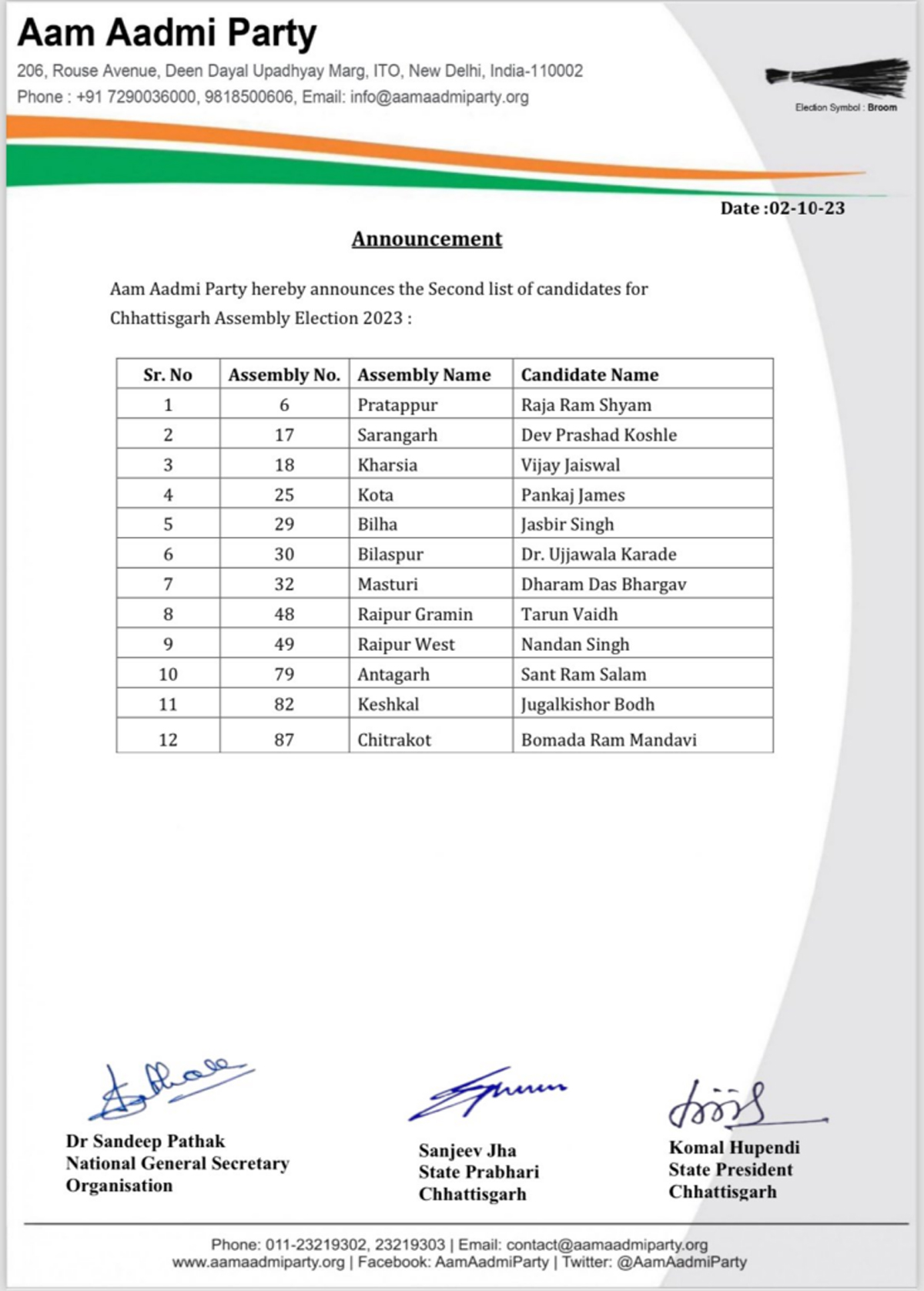 रायपुर। आम आदमी पार्टी ने प्रत्याशियों की दूसरी लिस्ट जारी कर दी है। इस लिस्ट में 12 प्रत्याशियों के नाम हैं। आम आदमी पार्टी ने 12 और प्रत्याशियों की लिस्ट में प्रतापपुर से राजाराम, सारंगढ़ से देव प्रसाद, खरसिया से विजय जायसवाल, कोटा से पंकज जेम्स, बिल्हा से जसबीर सिंह, बिलासपुर से डॉक्टर उज्ज्वला कराडे, मस्तूरी से धर्मदास भार्गव, रायपुर ग्रामीण से तरुण वैद्य, रायपुर पश्चिम से नंदन सिंह, अंतागढ़ से संतराम सलाम, केशकाल से जुगल किशोर, चित्रकोट से बोमाडा राम को टिकट दी गई है।