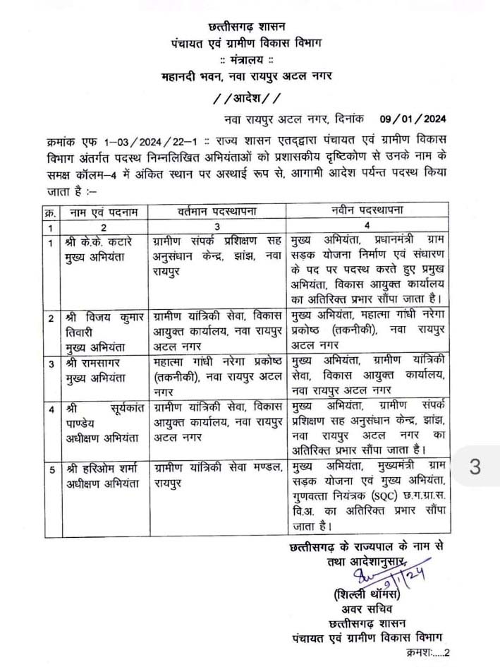 बता दें कि पंचायत एवं ग्रामीण विकास विभाग में बड़ा फेरबदल हुआ है। 3 CE, 2 SE का विभाग बदला गया है। जारी ​आदेश के अनुसार के के कटारे pmgsy के मुख्य अभियंता बनाए गए हैं। वहीं विजय तिवारी, CE मनरेगा तकनीकी प्रकोष्ठ बनाए गए हैं। रामसागर, CE ग्रामीण यांत्रिकी सेवा बनाए गए है। सूर्यकांत पांडे, ग्रामीण संपर्क प्रशिक्षण केंद्र के CE बनाए गए हैं और हरिओम शर्मा को सीएम ग्राम सड़क योजना के CE की जिम्मेदारी दी गई है।